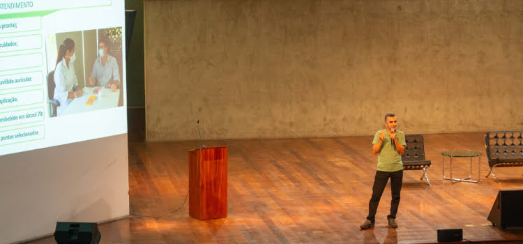 Profissionais de saúde que atuam na Atenção Primária em Minas Gerais participam, entre os dias 9 e 11/10, de uma aula prática do Curso de Formação em Auriculoterapia para Profissionais de Saúde da Atenção Básica, ministrada no Auditório Juscelino Kubitschek, na Cidade Administrativa. A capacitação é uma parceria da Secretaria de Estado de Saúde de Minas Gerais (SES-MG) com o Núcleo Técnico de Práticas Integrativas e Complementares em Saúde (Pics) do Ministério da Saúde e a Universidade Federal de Santa Catarina (UFSC).