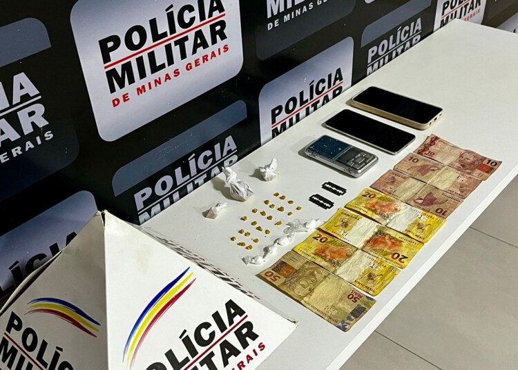 Foi realizada abordagem e durante as buscas foram encontradas 25 pedras de crack, 04 papelotes de cocaína, 01 balança de precisão, 02 telefones celulares, 02 lâminas e R$140,00.
