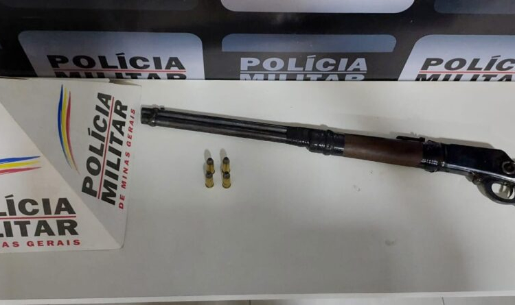 Durante verificação foi encontrada em uma sacola amarrada ao veículo uma arma de fogo, tipo carabina, calibre 44, com 04 munições.