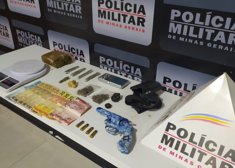 Os materiais foram dispensados pelo autor e localizados pela equipe Tático Móvel em um local de difícil acesso, foram apreendidos 01 revólver calibre .32, 04 cartuchos do mesmo calibre, 01 barra, 04 tabletes e 02 invólucros de maconha, R$420,00 em dinheiro, 01 pedra grande de crack, 02 balanças de precisão, 02 bolas de haxixe e 01 coldre de polímero.
