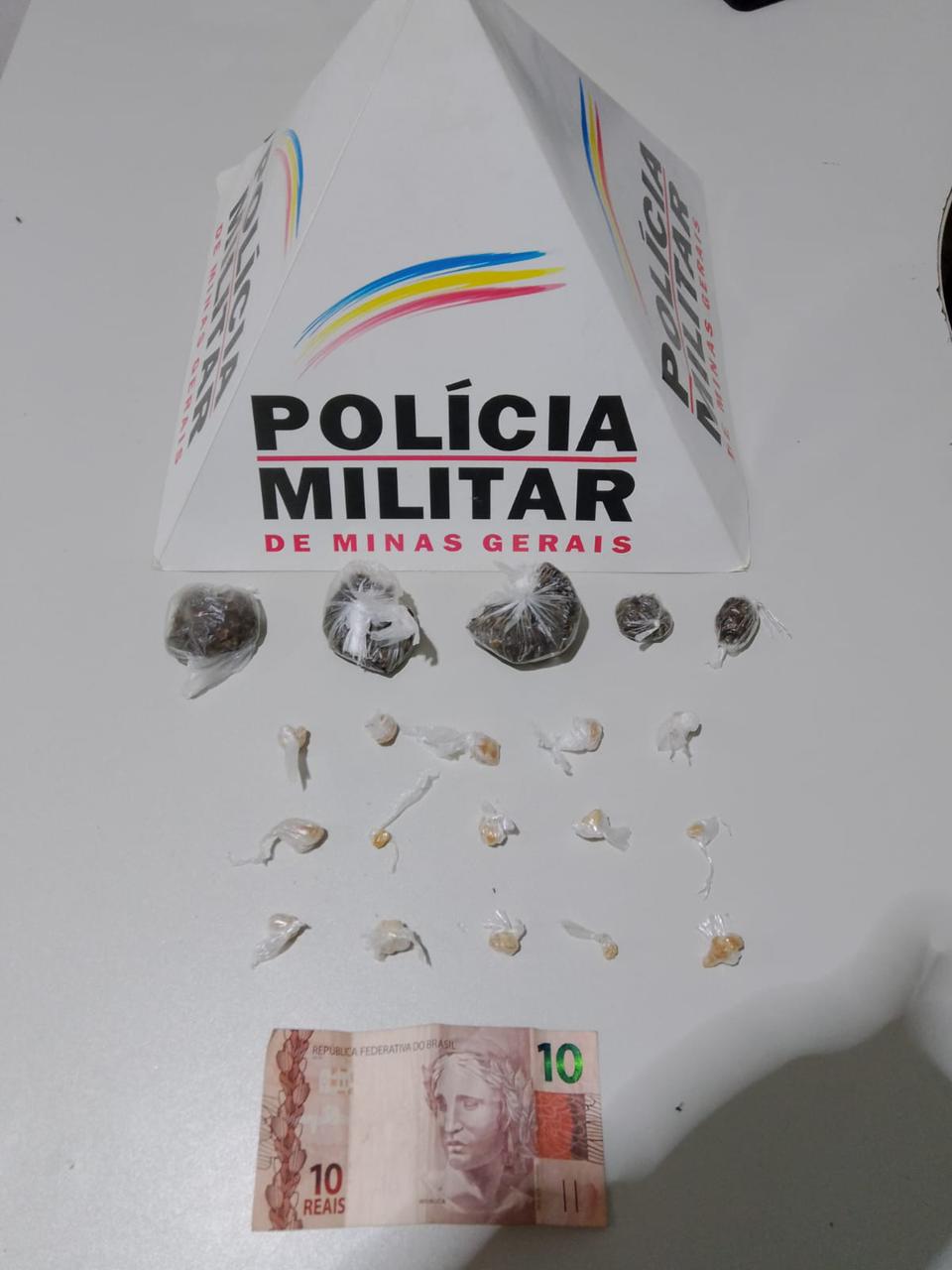 Durante a busca pessoal, foram encontradas 15 pedras de crack, 05 buchas de maconha e R$10,00 em dinheiro. O adolescente assumiu a propriedade do material.