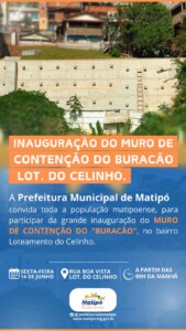 Um sonho de mais de 20 anos dos moradores do Loteamento do Celinho, em Matipó, finalmente se torna realidade. A obra do muro de contenção do Buracão, uma das maiores já realizadas na história do município, está nos retoques finais e tem data marcada para ser entregue à população.